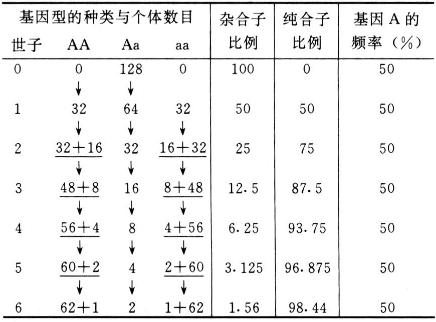 这是近交最基本的遗传效应。以植物的自花授粉(自交)为例。若有一对基因A与a,设亲代有128个个体,它们都是杂合子(Aa),且假定均无选择上的优劣,每代都保持128个个体。连续世代的近交,其结果是杂合子所占比率逐代减少(每代减少一半,到第10代时只有十分之一),并最终归于消灭;而两种纯合子(显性纯合子与隐性纯合子)则逐代增加(表1)。