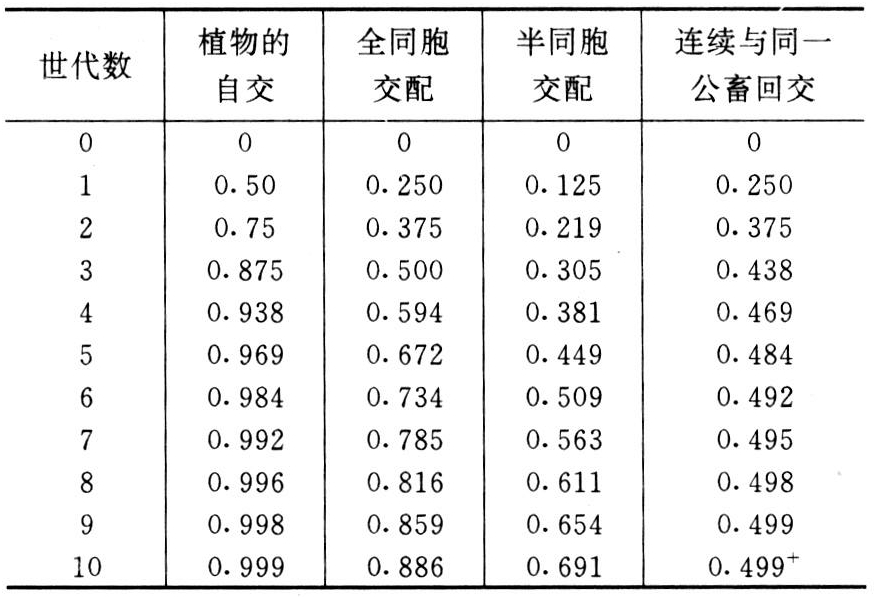 家畜虽为异体受精动物,不存在自交,但近交后代中纯合子增加、杂合子减少的趋势并无两样,只不过基因纯合化的速度变慢而已,而且越远的亲属交配,纯合化的速度愈慢,表2中的数字说明了这一点。譬如要达到50%的近交系数(近交系数也就是近交所生个体会是同源纯合子的机会,对于一个群体可反映群体中纯合子所占比率的可能性),自交只需一代,全同胞需三代,较温和的半同胞交配则需六代。