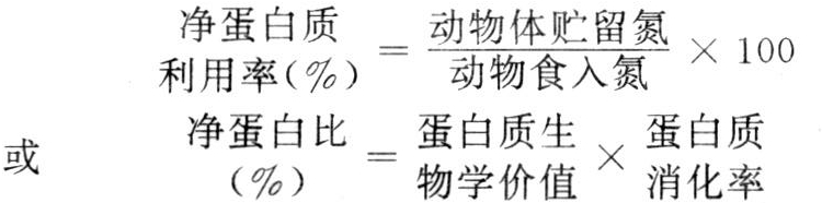 以饲料中的粗蛋白质含量乘以蛋白质净利用率即可得出动物体对该饲料蛋白质的存留量,所以又有净蛋白价(net protein value,NPV)之称。蛋白质生物学价值与净蛋白质利用率(NPU)不同之处是前者以食入氮量为基础计算,而后者是以消化吸收的氮量为基础计算。