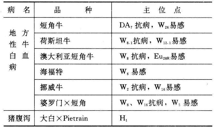 公式指出了直接和间接选择遗传增进的相对大小,取决于免疫应答和抗病性状的遗传力和它们之间的遗传相关。对免疫应答进行选择,可以增强疫苗接种及药物的协调相互作用,从而导致抗病家畜数量增加,将免疫应答作为抗病选择的标记,可以明显地提高选择作用。对与疾病有关的主要位点的应用,也是抗病选择的重点,是最有希望的。已经知道,某些疾病是受许多位点的影响,每个位点的作用较小。主要组织相容性复合体(MHC)包含有疾病的畜禽、小鼠和人类免疫性状有关的主位点(Major loci),例如家禽中的B21等位基因,对抗马立克病(Marek's disease)有主要影响,具有B21的鸡不易感染,具有B3、B5、B13、B19和B27等位基因则易感染,牛的淋巴细胞抗原(BoLA)中,W2抗乳房炎,W16则易感染,W8.1抗白血病,W12.1则易感染等,因此研究MHC与免疫应答性状以及疾病之间的关系,找出影响疾病的主基因是抗病育种中极为重要的(见表)。