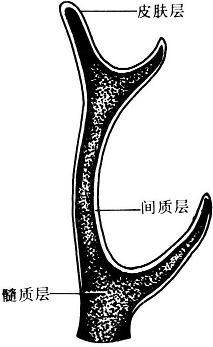 横切面分为皮肤层、间质层和髓质层;纵切面分为增生带、成熟带、肥大带、钙化带、初级松质带和次级松质带。鹿茸富含血管和神经,生长极快。鹿茸继续生长,随骨化程度的加深,脱去茸皮成为鹿角(图1)。