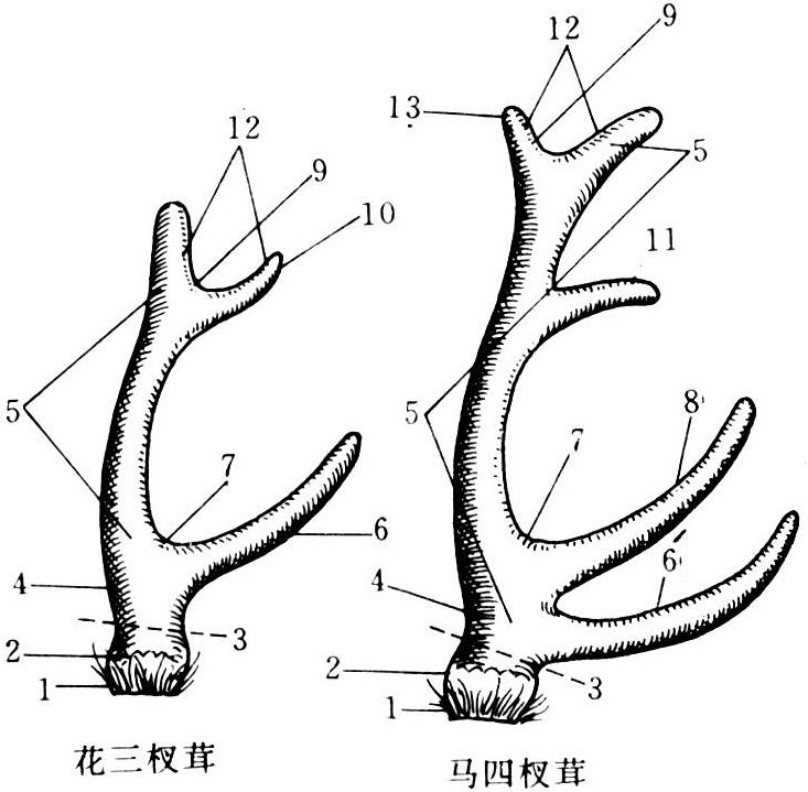 根据鹿种分为梅花鹿茸、马鹿茸、白唇鹿茸、水鹿茸等;按收茸方式分为锯茸和砍茸;按茸形梅花鹿分为二杠茸、三杈茸(图2),马鹿分为莲花茸、三杈茸、四杈茸;按加工方式分为带血茸和排血茸;此外,有再生茸、初角茸和畸形茸(亦称怪角)。鹿茸是养鹿业的主产品,也是中国传统的珍贵出口商品。鹿茸有滋补强壮、调节机体新陈代谢、促进生理机能活力和抗衰老等作用,有很高的药用价值。
