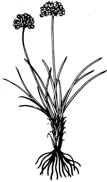 具鳞茎,从鳞茎盘发出须根,浅土黄色。数个鳞茎簇生在一起,鳞茎圆柱形细长,外皮纤维状,浅黄白色,松散。叶基生,半圆柱形,实心,短于花葶,花葶圆柱形,高10~35厘米,伞形花序近球形;小花淡红色至淡紫色。花被6片,2轮,卵状长圆形,内轮比外轮稍长,花丝近等长,长约为花被的2/3,基部合生。花柱不伸出花被(图)。
