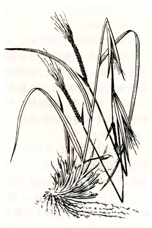 秆直立,高40~90厘米。叶鞘扁而具脊,叶扁平或对折,长10~20厘米,宽3~6毫米。总状花序单生茎顶,长3~7厘米。小穗成对并作覆瓦状排列,花序下部3~10对小穗不孕,上部各节小穗1无柄,1具柄,结实的无柄小穗长6~8毫米,基盘尖锐。第一颖近革质,第二颖较窄,具2脉。第一外稃长圆形,远短于颖,第二外稃极窄,退化成芒的基部,芒二回膝曲,长6~10厘米。有柄小穗不结实,偏斜盖于无柄小穗上(图)。