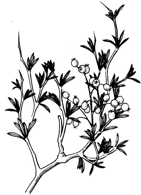 高30~60厘米。茎弧形弯曲,不孕枝先端刺状,树皮黄褐色,嫩枝灰白色。叶小,2~3个簇生,狭倒披针形,长0.5~2.5厘米,宽2~4毫米,全缘,先端尖或钝。花白色。果实球形,为核果,中空,具有上面被密短柔毛的表皮。果核狭窄,纺锤形(图)。