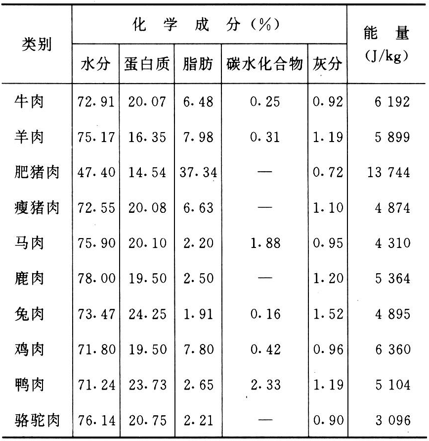 家畜肉中所含的各种化学成分。肉的化学成分主要有水分、蛋白质、脂肪、无机物、维生素及其他微量成分等。肉类蛋白质中含有全部营养所必需的氨基酸,生物学价值高。肉类蛋白质的种类主要有肌凝蛋白、球蛋白X、肌浆蛋白、肌白蛋白、肌球蛋白、肌纤维蛋白等。肉类脂肪中含有硬脂酸、油酸、棕榈酸、亚油酸、甘油、不皂化物等。肉中含有1%~2%的无机物,主要有钠、钾、钙、镁、铁、氯、磷、硫等。肉仅含少量碳水化合物(其中糖原约0.1%~3.0%,葡萄糖0.01%,以及微量果糖)和有机酸(乳酸、磷酸、醋酸等),含有微量的各种维生素、含氮化合物(肌酸、嘌呤碱、肌肽、肌醇、尿素)和色素(胡萝卜素、胡萝卜素醇、细胞色素、血色素等)。不同种属畜禽肉的营养成分差异较大,若按营养物质在畜体内沉积的脂肪量比较,以猪肉为最高,其次为牛肉、羊肉和鸡肉(表)。