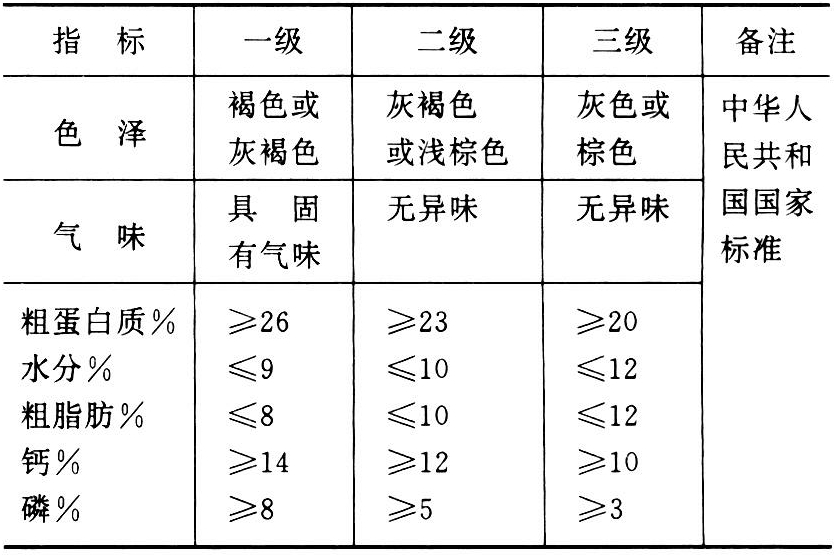 中华人民共和国《骨粉及肉骨粉》的国家标准外观状态规定呈粉状,按感官及理化指标分为三级(表)。
