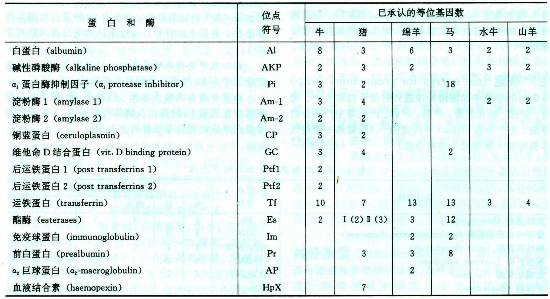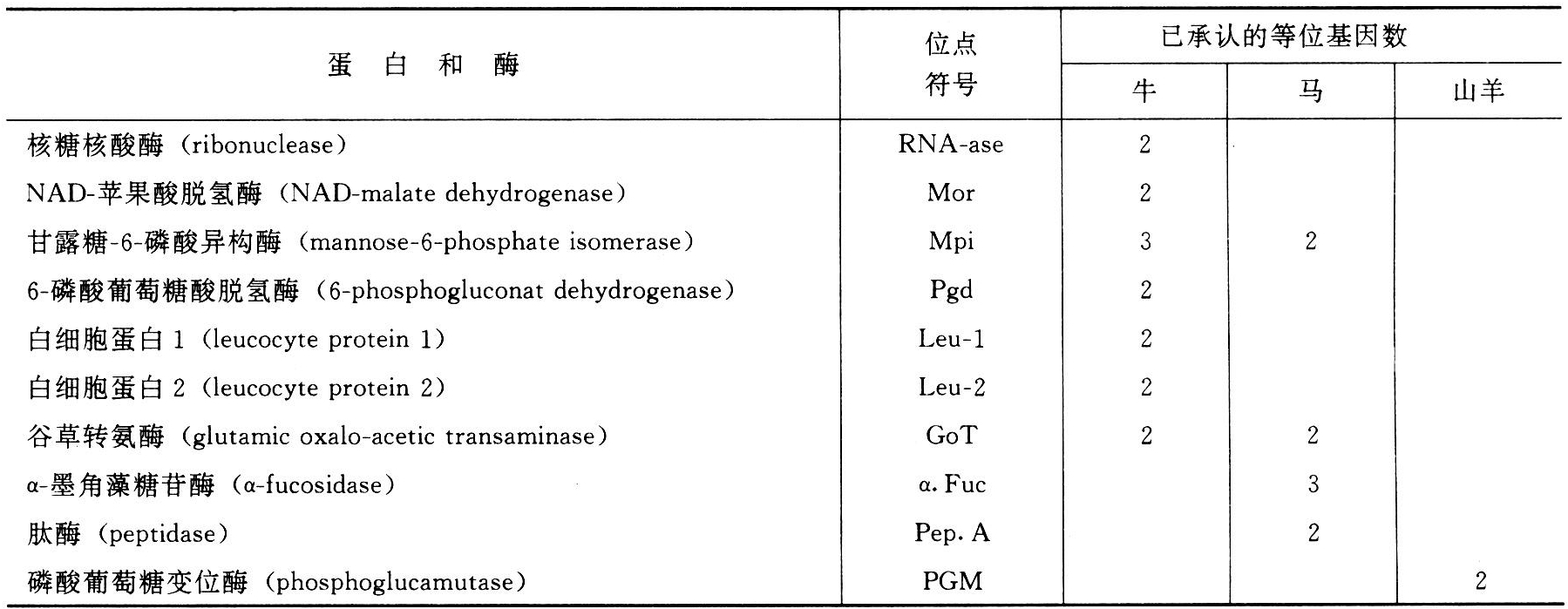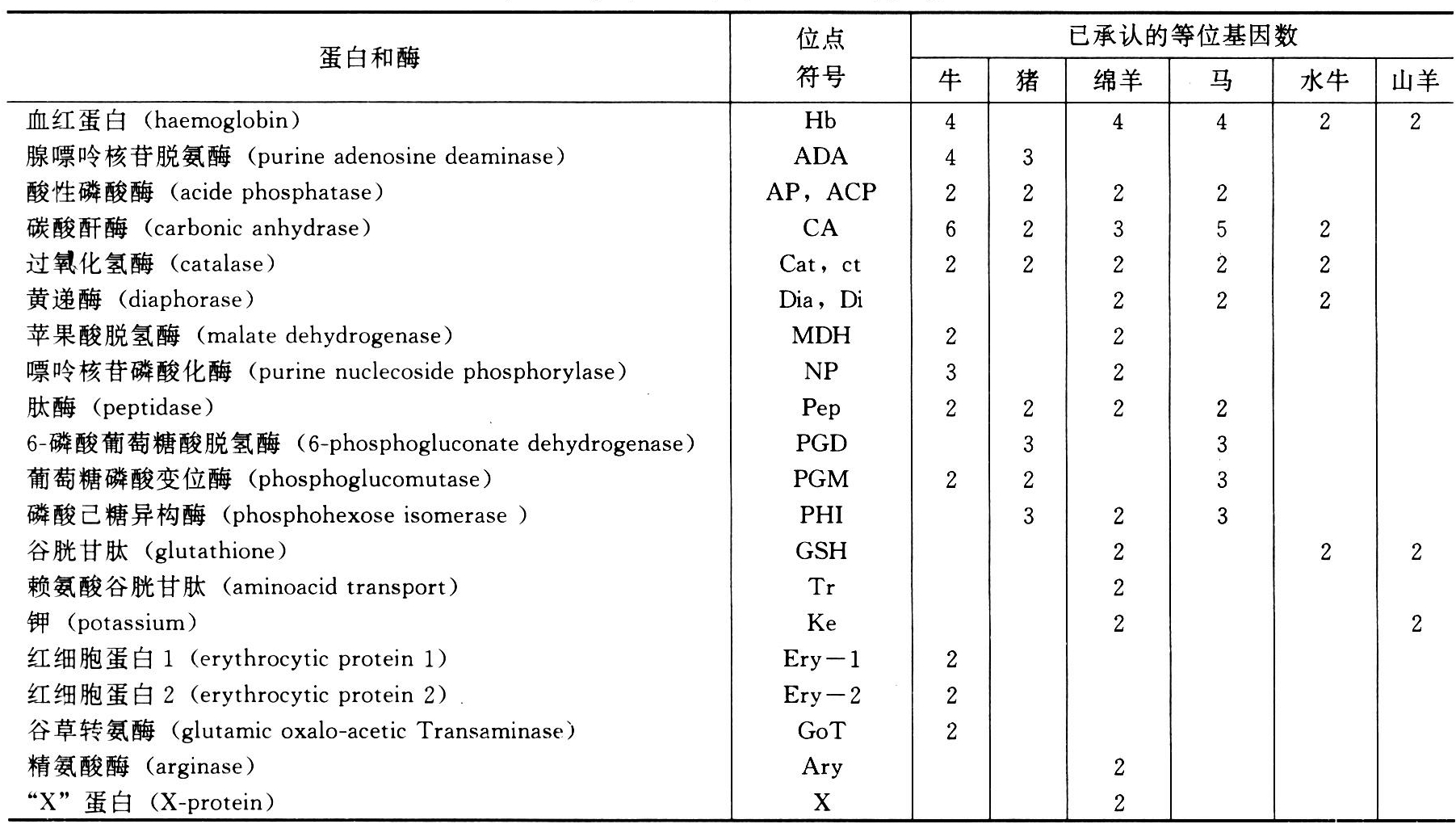 已在牛、猪、绵羊、山羊、马、水牛的红细胞中,发现有20种蛋白和酶具有多态性,各位点的符号以及已承认的等位基因数列于表1。