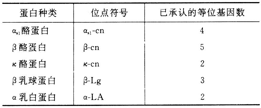 乳中的蛋白有80%是以酪蛋白(casein)形式存在,牛奶中的酪蛋白有三个主要形式,即αs1、β及к酪蛋白,剩下的蛋白为乳清蛋白(whey protein),以两种形式存在,即β乳球蛋白(β-lactoglob-ulin)及α乳白蛋白(α-lactalbumin),每个蛋白有两个或两个以上的遗传变异体(表4)。