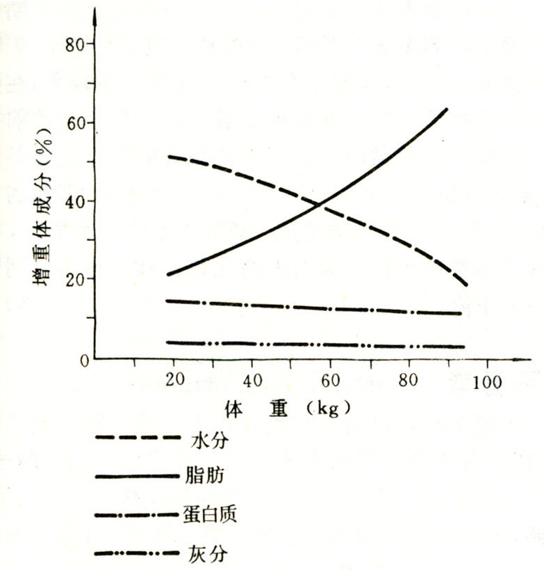 畜体化学成分随生长肥育期进展而呈现的相应变化。幼畜的生长主要是骨骼、肌肉和内脏,体成分中含有较多的蛋白质、矿物质和水分;随着生长成熟,畜体成分中脂肪含量显著增加,水分相应减少,蛋白质与矿物质所占比重略有减少。幼龄家畜生长速率高,蛋白质代谢强度大,体内蛋白质沉积量较多,细胞组织中含水分较高。生长接近成熟时,畜体的脂肪沉积增多,细胞组织中的一部分水分逐渐为脂肪所替代,到生长肥育后期,则以沉积脂肪为主。脂肪沉积的部位具有顺序性,一般首先贮积于内脏器官附近,其次在肌肉之间,继而于皮下,最后积贮于肌肉纤维之间,形成所谓“大理石”状肌肉。生长肥育期猪体成分的年龄变化见图。