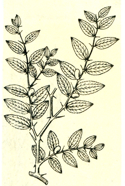 高1~3米。枝上有两种刺,一种为针状,另一种为反钩状。叶长椭圆形至卵状披针形,先端尖或钝,边缘有细锯齿,基部三出脉。花黄绿色,2~3朵簇生于叶腋,具短梗、萼片、花瓣,雄蕊5,子房2室。核果,近球形,熟暗红色(图)。