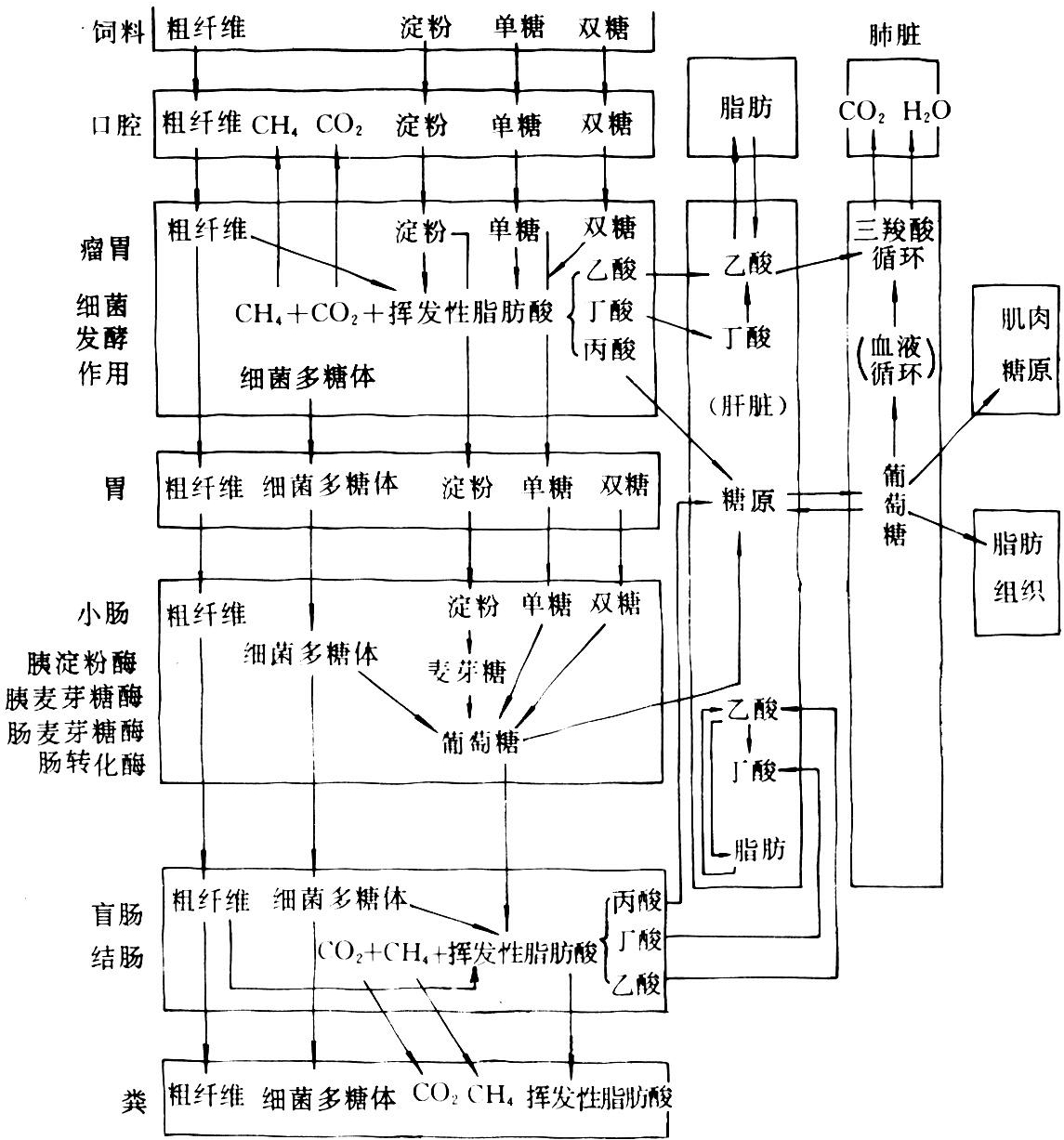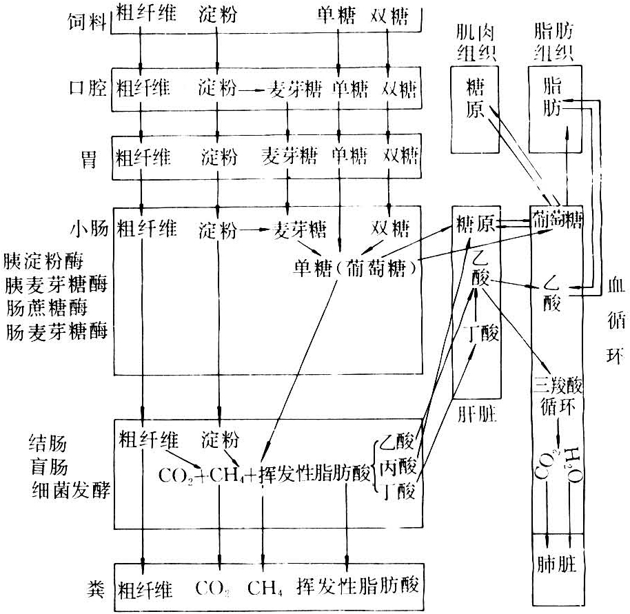 饲料中绝大部分可溶性糖、淀粉在瘤胃内降解。如采食量大会有相当数量的淀粉避开瘤胃发酵,通过皱胃直接进入小肠,细菌多糖体也随食糜进入小肠。在淀粉酶、麦芽糖酶、1,6-葡萄糖苷酶作用下分解为葡萄糖。在瘤胃未被降解的纤维素、半纤维素进入大肠进一步降解,其途径及产物类似瘤胃。反刍家畜碳水化合物的消化与代谢途径见图