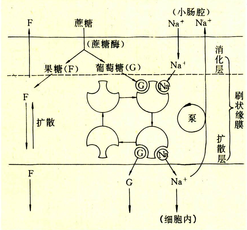 小肠内形成的单糖,由小肠上皮细胞的刷状缘吸收。对机体有重要作用的葡萄糖、半乳糖能够逆着浓度梯度主动吸收。在刷状缘上有钠泵(Na+-K+—ATP酶)和载体,与葡萄糖形成葡萄糖—载体-Na+三联复合物。由于它的形成,致使膜外的三联复合物产生了浓度梯度,通过扩散向膜内侧转运。由于细胞内钠浓度较低,载体与钠脱离,同时葡萄糖也和载体相脱离,载体又重新返回刷状缘膜的表层。一部分脱掉的Na+通过钠泵的作用又返回到肠腔,另一部分钠则与葡萄糖一起从浆膜侧被转运到血液中。葡萄糖吸收机制见图3。