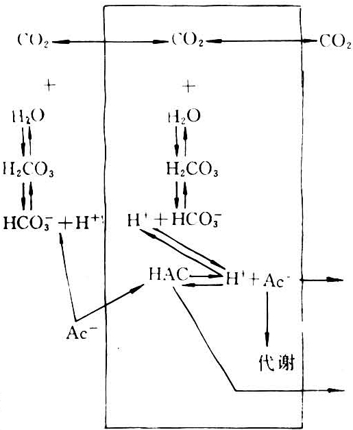 在瘤胃、大肠产生的挥发性脂肪酸(VFA),由瘤胃和大肠吸收。VFA在胃、肠正常pH值条件下(中性或略偏酸),主要以阴离子形式存在,难以通过脂质双层膜。但是,可以利用CO2发生水化作用所释放出的氢离子,将离子态的挥发性脂肪酸(Ac-)转变成分子态的挥发性脂肪酸(HAC)不断提供H+的来源。值下降,VFA愈倾向于以未电离形式存在,增大其脂溶性,使其更容易通过质膜吸收。于是积聚的VFA得以迅速转移,结果使pH值回升。
