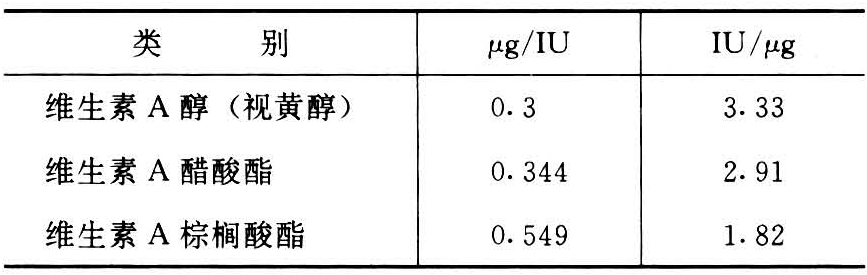 维生素A纯品为浅黄色结晶。不溶于水,溶于有机溶剂。在光和空气以及湿热环境中易氧化。维生素A的计量单位一般用国际单位(IU)表示。美国药典单位(USP)与国际单位等值。不同维生素A化合物的活性各有差异(表)。
