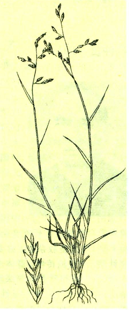秆直立或稍倾斜,高15~50厘米,基部具密集枯叶鞘。叶鞘口具长柔毛,叶舌长0.5毫米,具短纤毛,叶条形,长2~6厘米,扁平或边缘内卷。圆锥花序开展,长2~8厘米,分枝平展或稍斜上。小穗长4~8毫米,含3~6小花。颖卵状披针形,具1脉,第一颖长2~3毫米,第二颖长3~4毫米。外稃卵状披针形,第一外稃长3~4毫米,5脉,先端无芒;内稃短于外稃(图)。