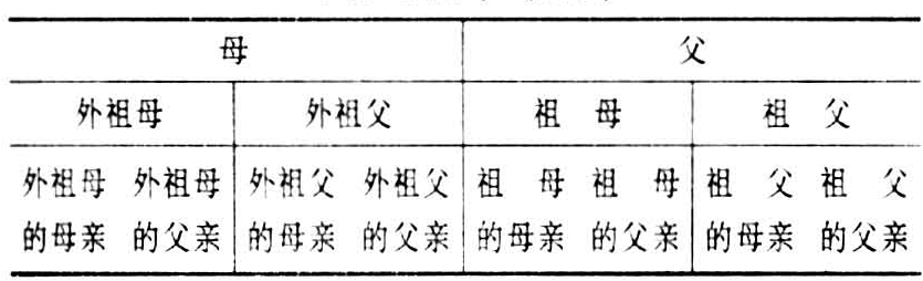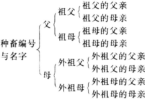 种畜的名字记在上端,下面是父母代,再下面是祖代、曾祖代。每一代祖先中公畜记在右侧,母畜记在左侧,系谱正中划一垂线,右半为父方,左半为母方(表)。