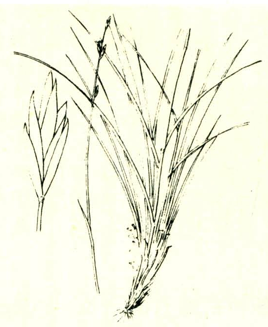 秆直立,基部具有褐色残存叶鞘,高40~60厘米。叶内卷,坚硬,基生叶长20~30厘米。圆锥花序紧缩,长4~10厘米。小穗长7~10毫米,含3~6小花,单性,雄花中具有不育雌蕊,雌花中具不育雄蕊。颖膜质透明,稍不等长。外稃具5脉(图)。