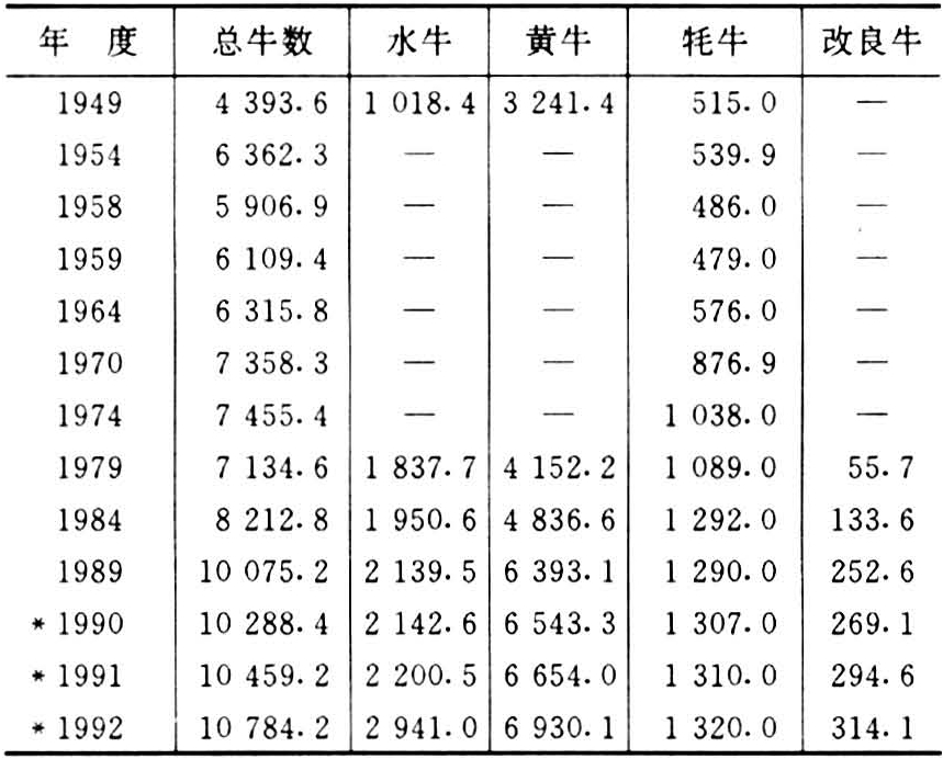 养牛业从1949年起到1973年进入缓慢发展时期。当时实行保护役畜的措施,于1955年实行了凭淘汰证收购的政策,黄牛于13岁以上,水牛于18岁以上为淘汰标准;到1973年以后政府主管部门重视牛种改良,在大城市用荷兰黑白花牛对本地牛进行改良。此后从美国、加拿大、德国、丹麦、新西兰等国多批引入种牛,建立了城市郊区和黑龙江农区的奶牛基地。1973~1974年两年内政府引进的肉用种牛有10个品种,共234头。分布在北京、河北、山西、内蒙古、辽宁、吉林、黑龙江、新疆、青海、云南、河南、湖北、湖南、广西、广东、江苏、江西、山东等19个省、市、自治区,并由国家计划委员会批准在黑龙江、吉林、湖南邵阳地区、河北承德地区建立肉牛生产基地,对广大农村的黄牛用肉用牛种进行改良。1979年农村开始经济改革,1979年2月国务院作出《关于保护耕牛和调整屠宰的通知》的规定;1983年和1984年国务院先后将农区和牧区的牛和羊改为议购和自由购销;1985年起基本上都实行了议购议销;养牛头数于1984年开始迅速增加。到1989年五年内增加1862.4万头,平均每年增加372.48万头;而1949年到1984年的35年内共增加3829.2万头,平均每年增加109.12万头。这五年的每年平均增长数相当于35年平均增长数的3.4倍(表1)。