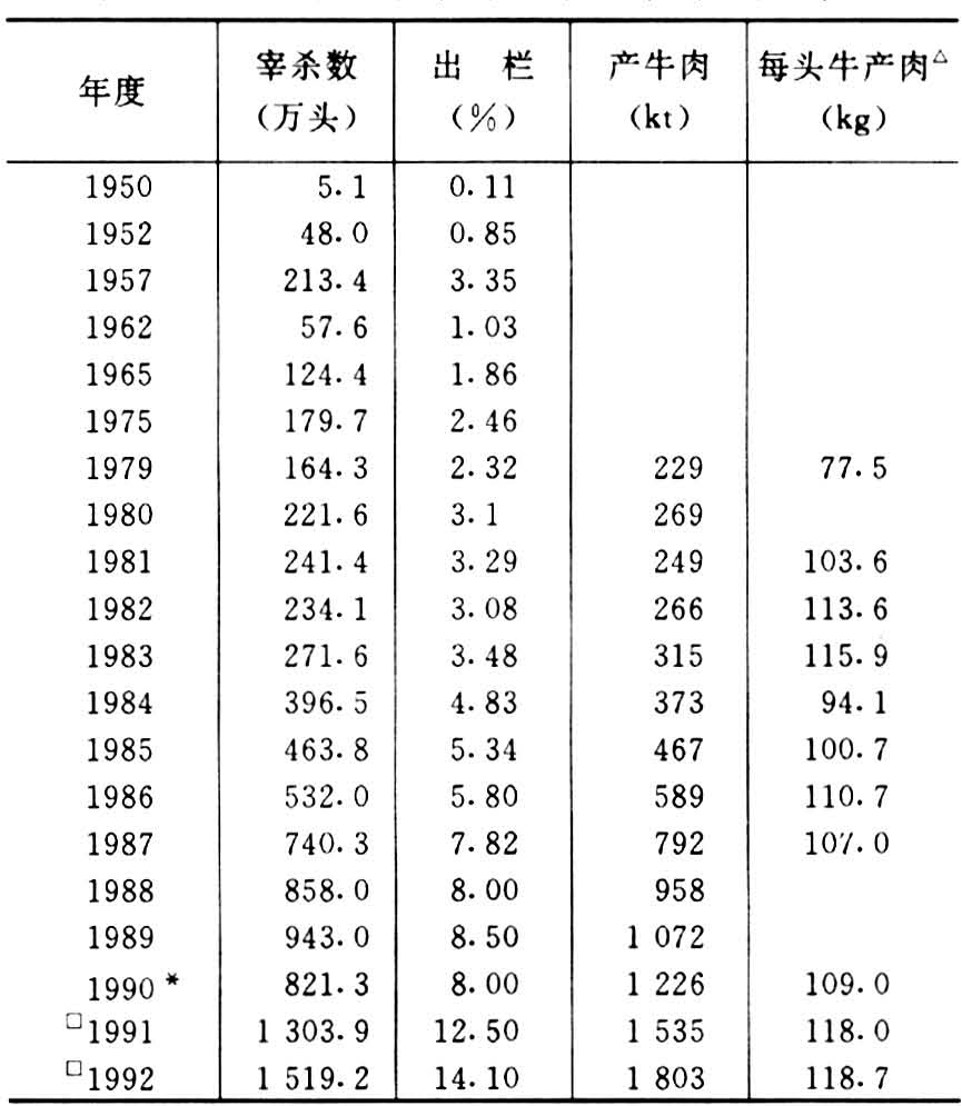 从1949年到1979年以老、残牛为牛肉生产来源,养牛业只能提供菜牛。从1973年以后黄牛改良逐年取得效果。10年后的屠宰牛比率达到4%以上,1984年达4.83%。1979年农业部在全国建立144个养牛基地县,加速牛改良工作的进展。以后肉牛业兴起,从东北和内蒙古牧区到华北北部进行移地肥育。河北省廊坊地区北三县形成规模化生产,黄淮海地区以改良牛为主要肉牛生产基地的建立,河南省周口、商丘、南阳地区的肉牛基地县建设,安徽省阜阳地区肉牛基地县建设,山东省烟台、菏泽等地区的肉牛基地县建设,都是在华北大型牛基础上改良取得效果的。到1990年全国牛肉总产量达122.6万吨,是1947年全国牛肉总产量的2.1倍。牛肉产量的增加在品种上主要依靠黄牛的改良,它首先是在牧区与半农半牧区改良成功开始的。辽宁、吉林、内蒙古等地交界地区草原红牛改良成功,以科尔沁草原为中心的东北地区用西门塔尔牛改良黄牛成功,新疆伊犁地区褐牛的改良成功,以及黄淮海地区用夏洛来牛、利木赞牛和西门塔尔牛的改良成功,使北方黄牛产区有了肉用培育品种的大面积改良区。加上黑白花牛公犊的肉用,全国有700多万头各个品种的改良牛。其次是出栏率的提高,如安徽省蒙城县于1984年和河北省赞皇县于1988年的出栏牛头数都达到28%,促进了牛群内部结构的调整,使母牛比例提高到45%以上,随着老龄牛的淘汰,牛的年龄结构年青化,肉牛业具有了专业生产形式。为规模型的就地育肥和移地育肥打下了基础。1992年以来牛肉的产量以20%的比率增加。1992年宰杀和出售的牛数达1519万头,牛肉总产量达180.3万吨,是1979年产牛肉量的787.3%,即接近8倍(表2)。