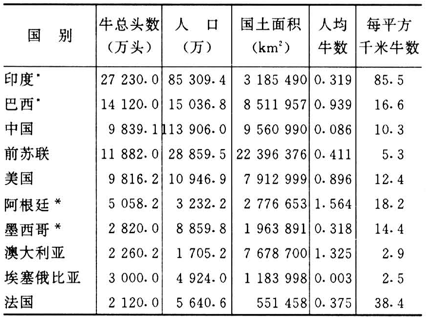表3 世界主要养牛国家(1990年)