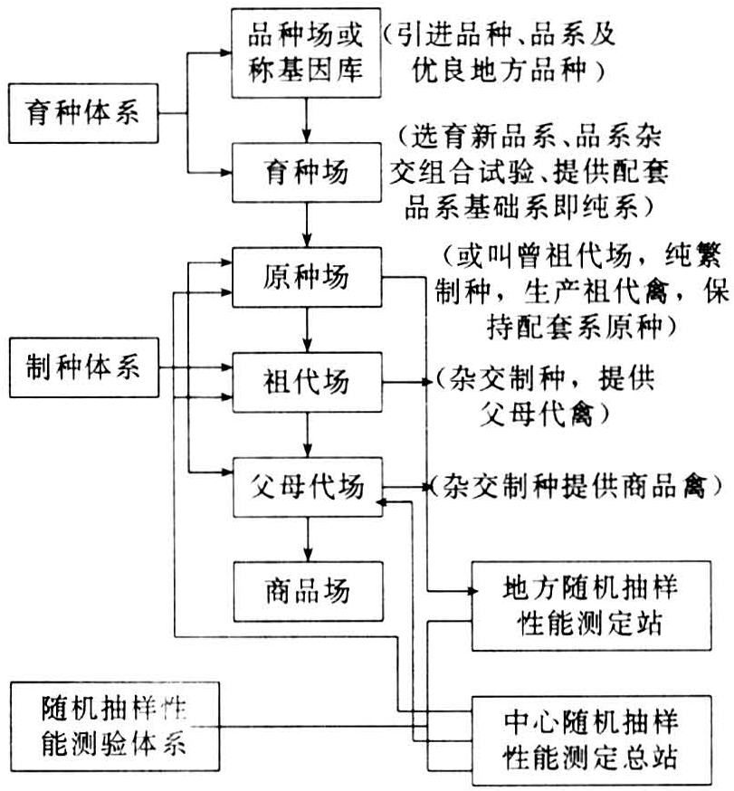 随着商业型养禽业的不断发展,分成了若干门类,每一门类具有自己的独立结构和特有机能、自成体系。但各种体系又是互相联系、相互依赖、相互制约、相互促进和共同发展的系统工程的关系。现代养禽业的系统工程包括六个体系:①良种繁育体系。商业型养禽业需要有高产、稳产、性能整齐一致的品种供应,主要靠效率较高的繁育体系,包括育种、制种和随机抽样性能测验三个部分(图)。