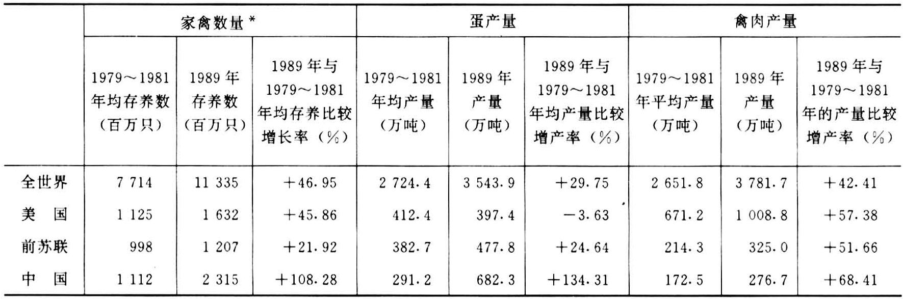从表中可以看出中国家禽存养数量和产蛋量均在1989年超过美国,居世界首位,但由于肉用仔鸡业还不发达,禽肉产量还落后于美国和前苏联。但从发展速度看,无论家禽存养数、蛋产量和禽肉产量,中国的增长率均高于世界各国。