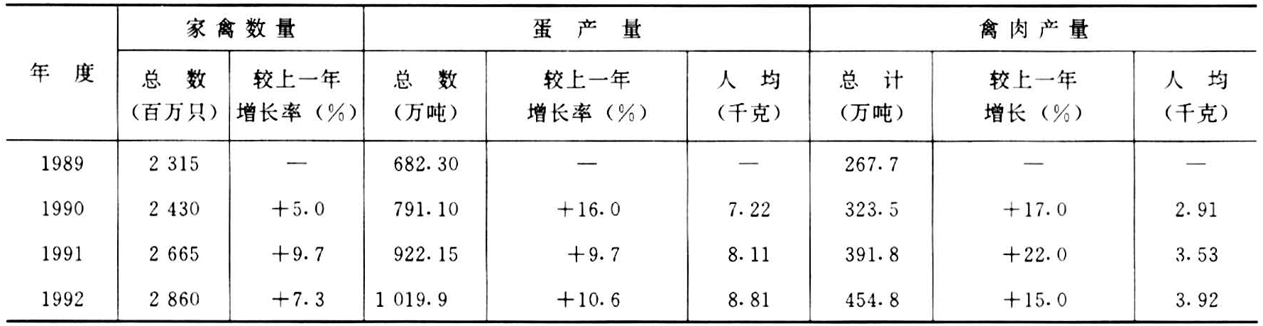 据《中国家禽》1991年第6期和《中国禽业通讯》第36期报道的统计资料,中国家禽存养数、蛋产量和禽肉产量自1989年跃居世界首位后,仍保持高速增长速度(表5)。