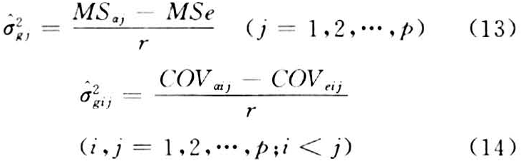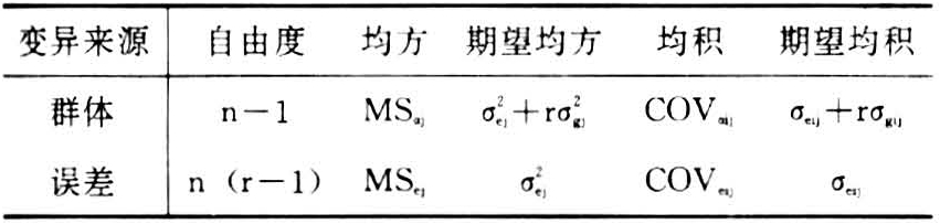 在模型式(12)下,第j个性状的方差分析,第i、j两性状的方差分析一般形式为:
