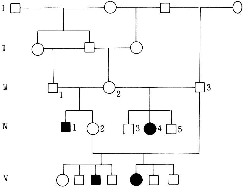 属于常染色体隐性遗传的遗传缺陷较多,如牛的侏儒病、后肢麻痹、关节挛缩、表皮缺损、鱼鳞、无毛症,猪的脑积水、脑疝、截肢、曲肢、肌肉挛缩、植物性皮炎、隐睾、应激综合症、内翻乳头、阴囊疝等。牛的无毛症系谱见图2。