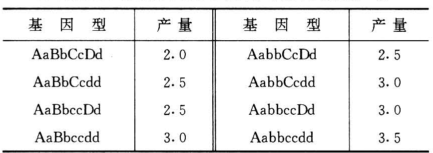 用一个经过高度选育的高产品种与需要选育提高的品种作测验交配(测交)就可以选出隐性有利基因频率高的个体。设高产品种个体的基因型为aabbccdd,它与个体中测交所得的后代有8种基因型,平均产量2.75单位(表)。而aabbc-cdd与个体乙aaBBCCDD测交,后代的基因型是aaB-bCcDd,产量为2.5单位。所以正确的选择应当是选甲而不选乙。