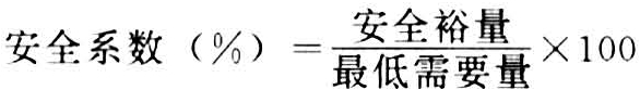 在营养需要的研究中有最低营养需要量、安全裕量的概念。前者是使动物处于特定的、保证正常生命活动以不出现任何营养缺乏临床症状的试验条件下所测得的各种营养物质的需要量。在生产实践中,只供给最低需要量是不够的,因为生产中有许多影响因素,致使动物对养分的需要量提高。同时,畜牧生产的目的不只是维持家畜正常的生命活动,而是要获取足够数量的畜产品。因此,必须供给比最低营养需要量多的营养物质,才能达到目的。营养学家根据具体情况,在此基础上酌情增加一定数量饲料,弥补因其他因素影响而提高的营养需要量,提高部分称为安全裕量(safety mar-gin)。安全裕量与最低需要量之比,称为安全系数。