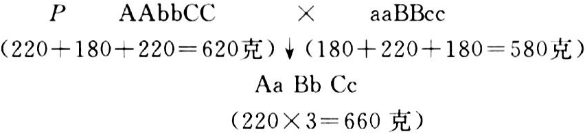 分别杂种优势程度就越大。以猪的日增重为例,假定两品系是相对基因的纯合子,且假定该性状受控于三对基因,每对显性基因决定220克的日增重,每对隐性基因决定180克。由于A对a、B对b、C对c均为完全显性,故在表型效应上Aa=AA>aa,余类推。两品系杂交,结果如图1。由图1可见,由于杂交,两亲本的显性基因相互补充,F1的显性基因位点增多,使F1表现出优势来。