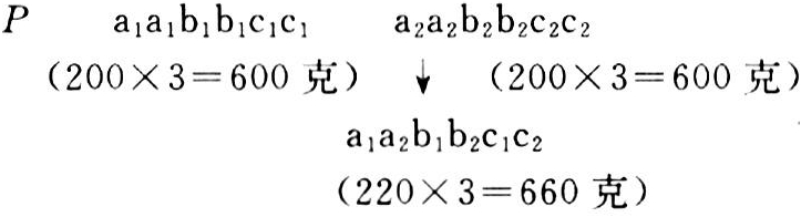 亦称杂合性说或等位基因互作说。由沙尔(G.H.Shuu)和叶斯特(E.M.East)分别于1908年首先提出,叶斯特于1936年又作了进一步的阐述。该说假定等位基因间不存在显隐性关系,杂种生活力的提高来自杂合性本身,即杂合子(如a1a2)优于任何纯合子(如a1a1与a2a2)。杂合位点愈多,杂种优势则愈明显。杂合子优于纯合子来源于等位基因间的相互作用。以猪的日增重为例,假定纯合态的a1a1、a2a2、b1b1、b2b2、c1c1、c2c2的表型效应为200克,杂合态的a1a2、b1b2、c1c2的表型效应均为220克,则F1优势的产生如图2所示。后来有些学者认为,不仅等位基因间存在互作,非等位基因间也存在着各种类型的互作,在这种情况下,杂种优势还进一步提高。