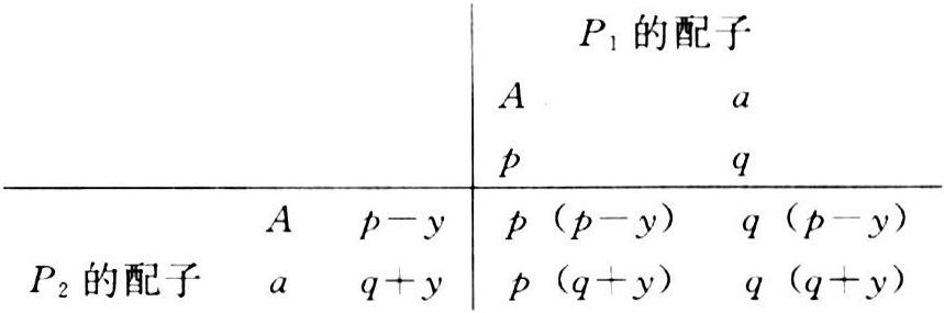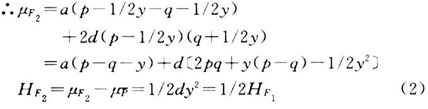 若有两群体P1、P2,其基因A与a的频率不同,设分别为p、q及p′、q′,频率差y=p-户′=(1-q)-(1-q′)=q′-q,于是p′=p-y,q′=q+y。由于μ=a(p-q)+2dpq,这里,a、d和-a分别为基因型AA、Aa、aa的基因型值,因而