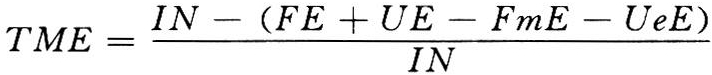以内源能校正的表观代谢能。是评定禽类饲料有效能值的一种生物学方法。家禽生命活动过程的代谢产物,除体热、气体、微量分泌物、表皮脱落物外,其余可见部分均由粪尿中排出。禽类是单孔动物其排泄物中的能量来源于许多层次,除了粪尿中的能量外还包含有内源性尿能(UeE)与代谢性粪能(FmE)。为此在用全收排泄物法求出的表观代谢能值,实际上低于真TME值。但是从方法学上如何客观地通过表观代谢能中判定UeE与FmE是个比较困难的问题。加拿大学者西贝尔德(I.R.Sibbald,1976)提出了TME测定方法。其基本假设是:①由禽类排泄物中排出的能量是食入能量的线性函数;②代谢性粪能与内源性尿能的损失量是个常数,不受饲料的性质和食入量的影响;③当食入量为零时,回归线Y轴的截矩与由同一试验用同体重的禁食排空试验鸡所得到的FmE+UeE值近似。其计算公式是: