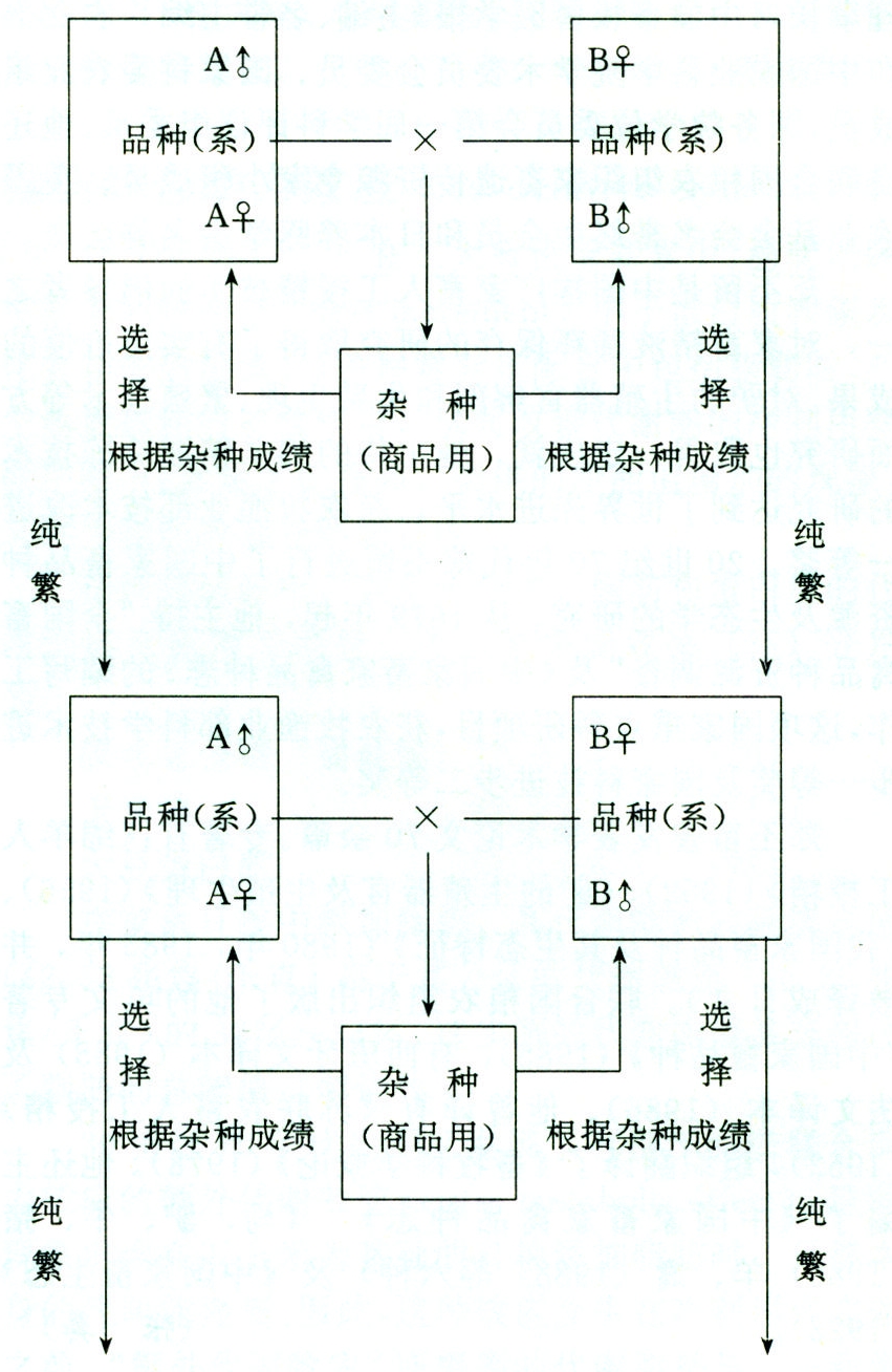 起始时是以A品种的公畜和B品种的母畜交配,B品种的公畜和A品种的母畜交配,产生杂种后代,其次是根据杂种的生产成绩选留亲本,杂种本身不留种;第三是在选留亲本中作品种(系)内的纯种繁殖。这样杂交、选择、纯繁三者交替重复进行,即获得了杂种优势,也提高了纯种生产性能。