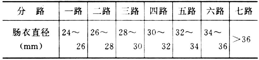 ①浸漂。将洗净的原肠放在清水中浸泡18~24小时,水温30℃左右为宜。②刮肠。浸泡后将肠取出放在木板上逐根刮制,刮去肠内外无用部分。③灌水。刮完后用水冲洗干净,灌水检查有无破孔。④量码。量原肠长度,按每节不短于1.35米,每把不超过18节,每91.5米配成一把。⑤腌肠。按每把肠衣加盐0.5~0.6千克腌渍,一次加盐,上好盐的肠衣放在筛中沥水。⑥缠把。腌肠后12~13小时,当肠衣呈半干状态时缠把即成“光肠”(半成品)。⑦洗涤。将“光肠”放在清水中浸泡,反复换水洗涤。⑧分路。洗净的“光肠”逐根灌水,按其口径大小分路(表)。⑨配码。将同一路肠衣,按一定规格尺寸扎成把。⑩腌肠及缠把。配码后,再用精盐腌上,水沥干后再缠成把,即为“净肠”成品。
