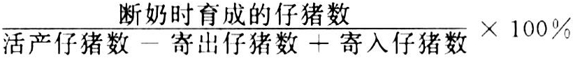 断奶育成的仔猪头数(包括代哺的仔猪数)与活产仔猪头数减去寄养出的仔猪数,加上代哺的仔猪数的比率,计算公式为: