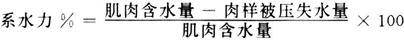 中国现行应用的系水力评定方法是用35千克重量压力法度量肉样的失水率,以计算肌肉的系水力。肉样部位:第1~2腰椎处背最长肌切取厚度为1厘米的薄片,再用直径为2.523厘米的圆形取样器切取肉样。测定时间:宰后2小时内。仪器:改装的钢环允许膨胀压缩仪或压力磅。方法:肉样称量后置于两层医用纱布之间,上下各垫18层滤纸,滤纸外各放一块硬质塑料垫板,然后置于压缩仪平台上,用匀速摇动摇把加压至35千克,并保持五分钟,撤除压力后立即称量压后肉样重。