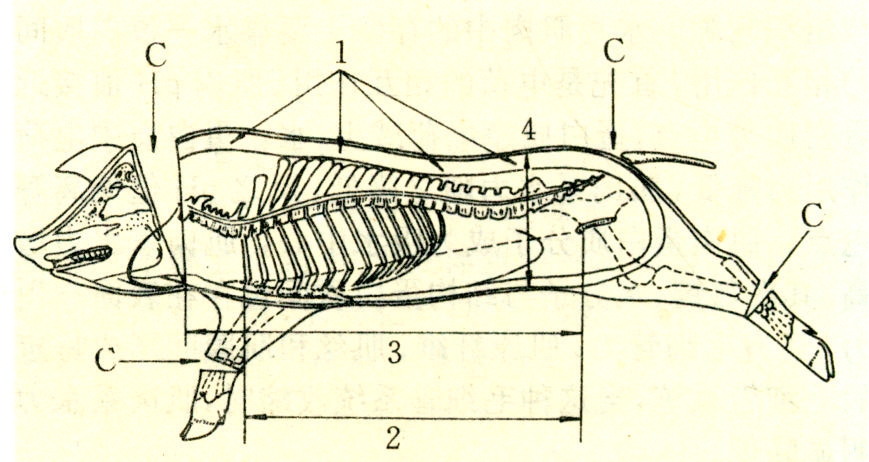猪屠宰后对其胴体的处置和测定,是衡量猪生产性能的重要方法之一。猪的屠宰测定有两种方法,多数情况下于屠宰后在屠宰现场立即进行,也有的将胴体放置一天(0~5℃)后于次日进行。