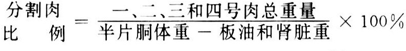 猪的屠宰测定项目繁多,主要的测定项目有(图):①屠宰率。胴体重占空体重的比例。其计算公式为:屠宰率(%)=胴体重/空体重×100%。②胴体长。从耻骨联合前缘中心点至第1肋骨与胸骨接合处中心点的长度为胴体斜长;如测量从耻骨联合前缘中心点至第1颈椎底部前缘的长度,为胴体直长。③膘厚。在第6和第7胸椎接合处测定垂直于背部的皮下脂肪层厚度,不包括皮厚在内。多点测定时,测量肩部最厚处、胸腰椎接合处和腰荐椎接合处三点的膘厚。可用其平均值来表示,但应说明为平均膘厚。④眼肌面积。在倒数第1和第2胸椎间背最长肌的横断面测量其面积。如无求积仪用下列公式估测:眼肌面积(平方厘米)=眼肌高度(厘米)×眼肌宽度(厘米)×0.7。⑤后腿比例。沿倒数第1和第2腰椎间的垂直线切下的后腿重量,占整个胴体重量的比例,其计算公式为:后腿比例=后腿重量/胴体重量×100%。⑥瘦肉比例(瘦肉率)。将剥离板油和肾脏的胴体分割为瘦肉、脂肪、骨、皮四种成分。剖分时肌内脂肪和肌间脂肪随同瘦肉不另剔出;皮肌随同脂肪,不另剔出。尽量减少作业损耗,控制在2%以下。瘦肉重量占四种成分总重的比例,即为瘦肉比例,其计算公式为:瘦肉比例(瘦肉率%)=瘦肉重量/(瘦肉重量+脂肪重量+皮肤重量+骨胳重量)×100%。⑦分割肉比例。胴体分割后的一、二、三和四号肉的总重量占分割前已经剥除板油和肾脏的胴体比例,它表示商品瘦肉率,其计算公式为: