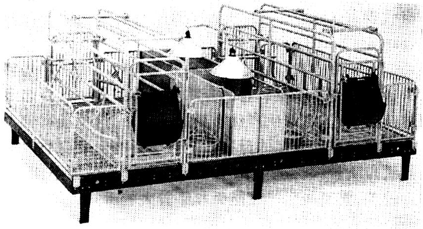 分娩和哺乳母猪的网床饲养可以有效地减少母猪压死、踩死仔猪,减少粪便污染和仔猪下痢,提高仔猪的成活率,减轻操作人员的劳动强度,并能提高母猪分娩舍的利用效率,其综合效率可提高20%~30%。分娩、哺乳母猪的网床(图1)分为网床和产仔架两部分,产仔架安装在网床的上面,网床长2.1~2.3米,宽1.6~1.8米,距地面高度一般为0.2~0.5米。产仔架长2.0~2.1米,宽0.65~0.7米,高0.9~1.0米。网床底部的网用铁棍焊接或硬塑压制,其间隙为0.8~1.0厘米,用钢丝编织,其网眼为1.0平方厘米,周边网栏高60厘米左右。分娩和哺乳母猪的网床中间部分为母猪限位区,两侧为仔猪活动区。限位区的前端装有母猪食槽和饮水器,尾端有防止母猪后退的装置(横杆)与连接仔猪活动区的通道。仔猪活动区有保温装置,如保温箱、电热板、红外线灯等,并备有仔猪饲槽和饮水器。