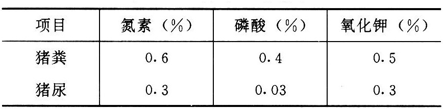 猪粪肥的肥分含量与饲养条件有密切关系,没有准确的数字,但在应用上,又常需要一个参考数据,据马复祥的研究,提出表1的参考数据。一头猪年产粪尿的肥分折算见表2。