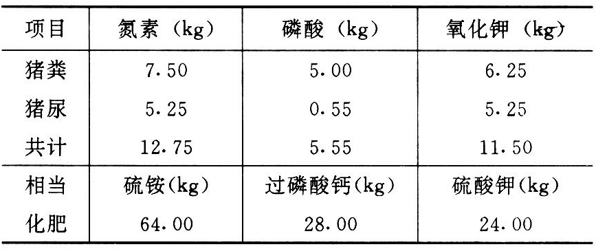 一头猪年排出氮素约12.75千克、磷酸5.5千克、氧化钾11.5千克,相当硫酸铵化肥64千克、过磷酸钙28千克、硫酸钾24千克,总计相当于116千克左右的化肥的肥分数量。若以氮素为标准来计算,一头猪的粪尿,可提供约10千克左右的氮素肥分,按每公顷75千克氮素肥计算,一头猪的粪肥可施农田0.17公顷。山东省阳谷县石门宋乡,1952年每公顷产粮5400千克。1955年每0.15公顷地平均养猪一头,粮产量提高为每公顷7500千克以上,说明养猪除提供肉食外,积肥造田也是有益的。