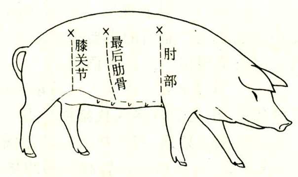 测膘部位 猪活体测膘的部位,一般在猪背部取A、B、C三点(图)。A点定在肘关节后缘至肩胛骨后缘与背中线垂直相交点,距背中线4厘米处;B点在胸腰结合部(即最后肋骨基部)距背中线4厘米处;C点为膝关节前缘线与背中线垂直相交点距背中线4厘米处。也可在距背中线6~8厘米处,分别测定A、B、C三点的边膘厚度(sidefat thickness)。