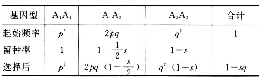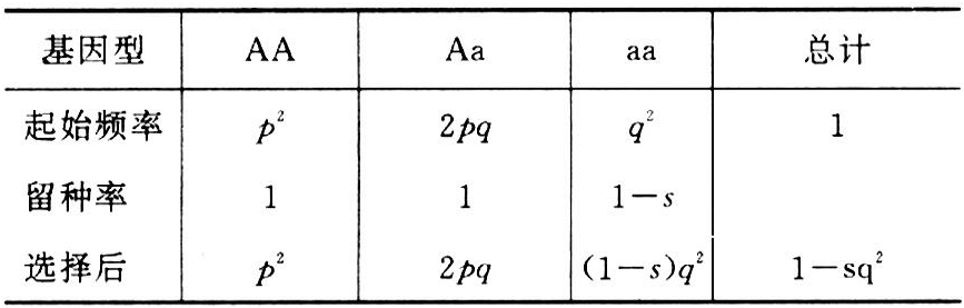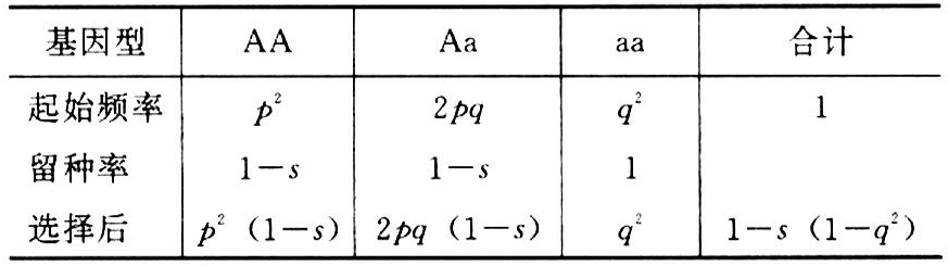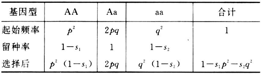 在此种情况下,显性纯合子与隐性纯合子可能具有不同的适应性,设AA的淘汰率为s1,aa的淘汰率为s2,于是后代各种基因型频率见表3。