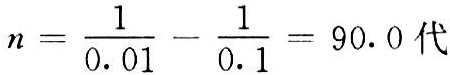 n为需要选择的代数。例如,群体中某隐性基因频率现为0.1,若淘汰全部隐性纯合子,令隐性基因频率降至0.01,则需要的代数为: