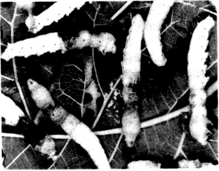 ①幼虫期病症:败血病虽因寄生细菌的种类不同而各有特征,但总的症状大致相同。首先停止食桑,运动呆滞,体躯挺直,继而胸部渐见膨大,胸脚伸直,腹脚后倾,腹部各环节收缩而中央部稍见隆起。排软粪或念珠状粪,濒死前往往吐出污液和排出黑褐色污液,最后侧倒死亡。初死时有暂时的尸僵现象,胸部膨大,头尾稍翘起而腹部拱出。几小时后尸体逐渐软化,体躯伸展,从此时起各种败血病因病原细菌种类不同而显现出特征。黑胸败血病在胸部背面或腹部第1至3环节出现墨绿色尸斑,很快扩展成前半身变黑(图1)。灵菌败血病蚕尸体变色较慢,有时在体壁出现褐色小圆点。随着尸体内组织的离解液化而逐渐全身变成嫣红色(图2)。青头败血病的病征因发病时期不同略有差异。5龄中后期发病的,死后不久胸部背部出现绿色透明的块状病斑,并在尸斑下出现气泡,故俗称泡泡蚕。但病斑并不变黑,经数小时后组织腐败,遗体呈土灰色(图3);5龄初期发病的胸部大多不出现绿色气泡。败血病蚕尸体最终都离解液化,仅剩几丁质外皮。体皮易破,流出恶臭污液。②蛹、蛾期病症:常见的败血蛹有两种。一种是急性败血蛹。发病迅速,蛹体变黑,液化扁瘪,不能拾起,体皮易破,流出恶臭的黑色或红色污液。另一种为慢性败血蛹。多为球菌感染引起,染病后背血管颜色逐渐加深直至黑褐色,然后延及全身,发病缓慢,死后尸体亦不迅速腐败。病蛾鳞毛污秽,活动力极差,翅不展振而极易折断和脱落,腹部先肿后瘪。发病快慢依感染细菌种类不同而有差异,快者一天之内死亡,也有在交尾中或在产卵时死亡的。死后腹内器官离解腐败,从环节间膜或鳞毛脱落处可透视腹内呈黑褐色或红色,最后化为污汁,仅剩头、胸、翅、脚等几丁质部分。病蛾很少产卵或不产卵。
