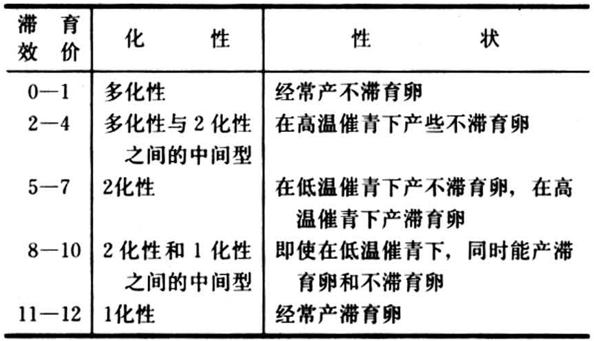 =0.1化性基因型(♀)WZHSH1H1H2H2H3H3、(♂)ZHsZHsH1H1H2H2H3H3,滞育效价为12;2化性基因型(♀)WZ+HsH1H1h2h2h3h3、(♂)Z+HsZ+HsH1H1h2h2h3h3,滞育效价为5;多化性基因型(♀)WZHsmh1h1h2h2h3h3、(♂)ZHsmZHsmh1h1h2h2h3h3滞育效价为0。据此永友雄区分化性类型为: